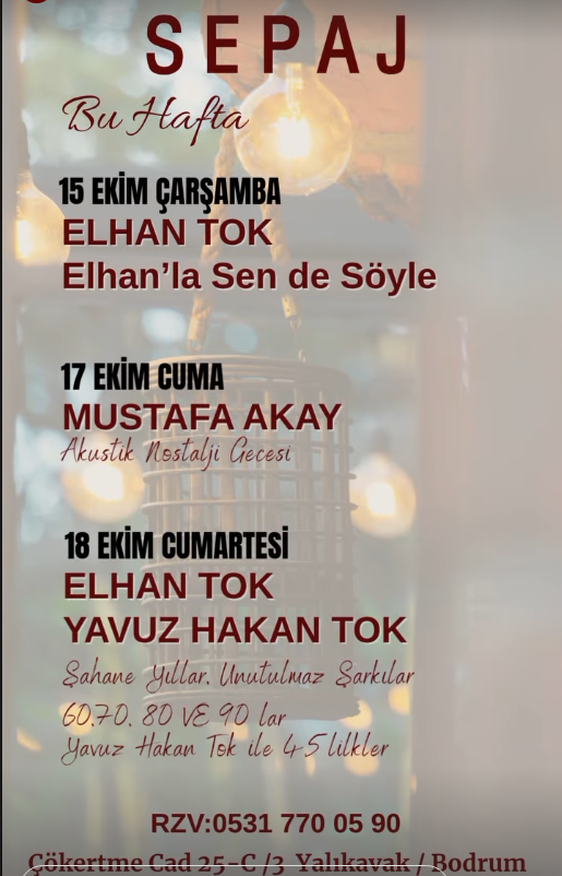 - 17 Ekim Cuma: Mustafa Akay’dan Akustik Nostalji Gecesi Cuma akşamı, sahneyi Mustafa Akay devralacak. Akay, seslendireceği parçalarla dinleyicileri akustik bir nostalji yolculuğuna çıkaracak, duygusal ve keyifli bir atmosfere imza atacak.