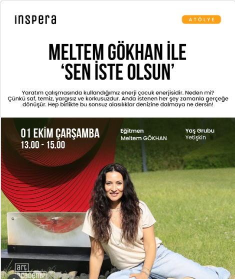 Inspera çatısı altında faaliyet gösteren Art Academy, kişisel gelişim ve yaratıcılık üzerine dikkat çekici bir atölye çalışmasına ev sahipliği yapmaya hazırlanıyor. Eğitmen Meltem Gökhan liderliğindeki “Sen İste Olsun” başlıklı yaratım atölyesi, katılımcıları çocuk enerjisiyle tanışarak sınırsız olasılıklar denizine dalmaya davet ediyor.