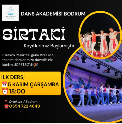 Dans Akademisi Bodrum, Ortakent’teki stüdyolarında açılacak Sirtaki kursları için kayıtların başladığını duyurdu. Yeni döneme ait ilk ders bilgileri şöyle: